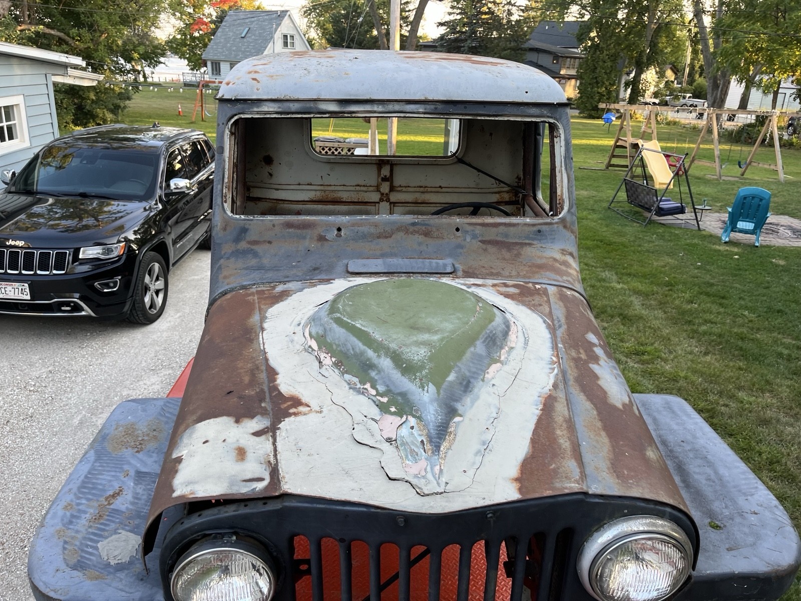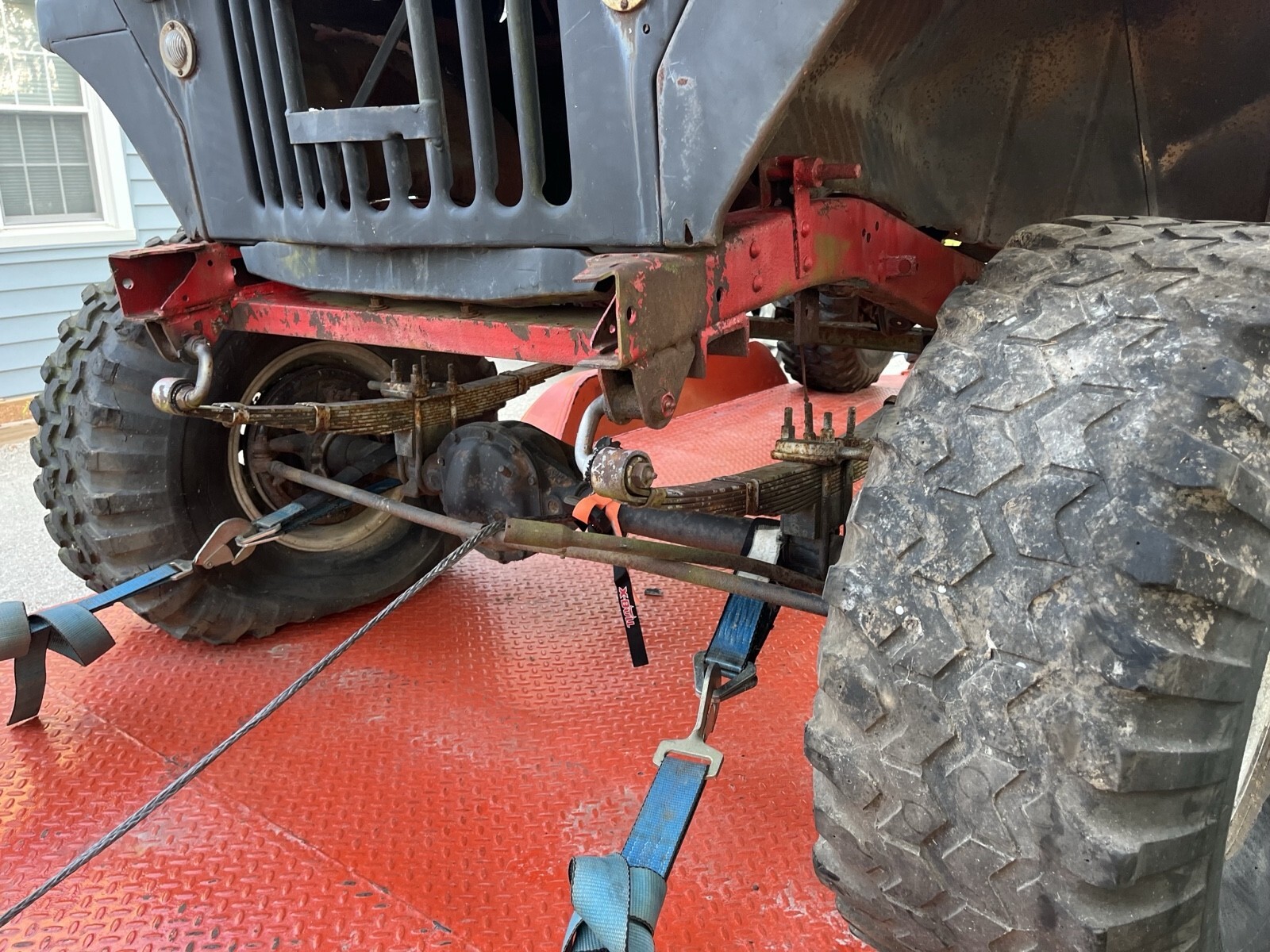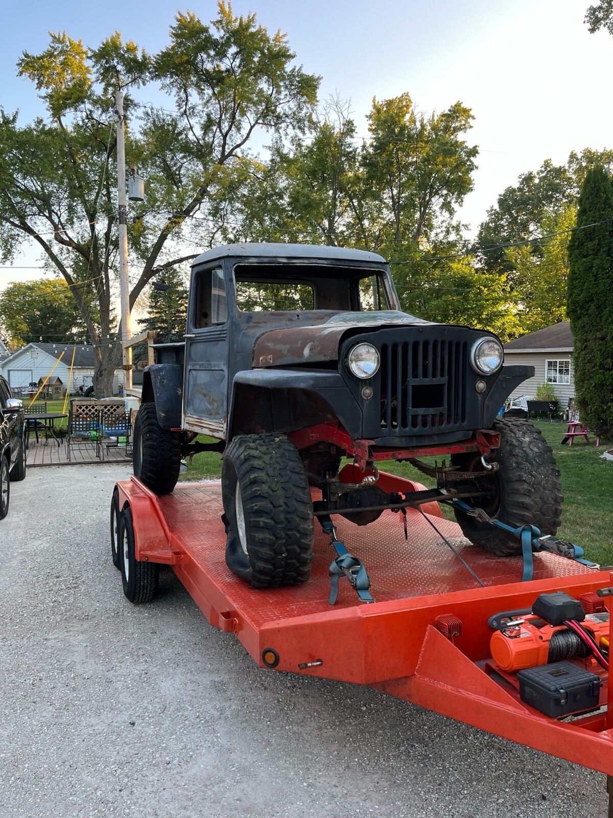 1950 Jeep Willys on 38 1/2 inch tall 15 wide 15 inch rim Mud tires, their gumbos original Jeep rear axle big lift kit, original frame, body hood bed upgraded front axle no motor needs some floor repair no transmission no title The hood scoop is just a façade. If you wanted to remove it it would be pretty easy to do. The hood is not cut. This truck would be great to turn back into a mud truck or use as a parts vehicle. Lots of potential left looks super cool would also make some really cool on lawn art