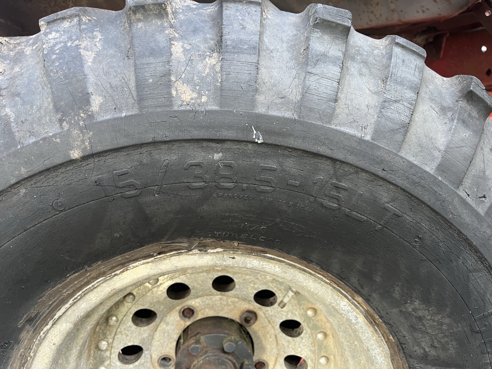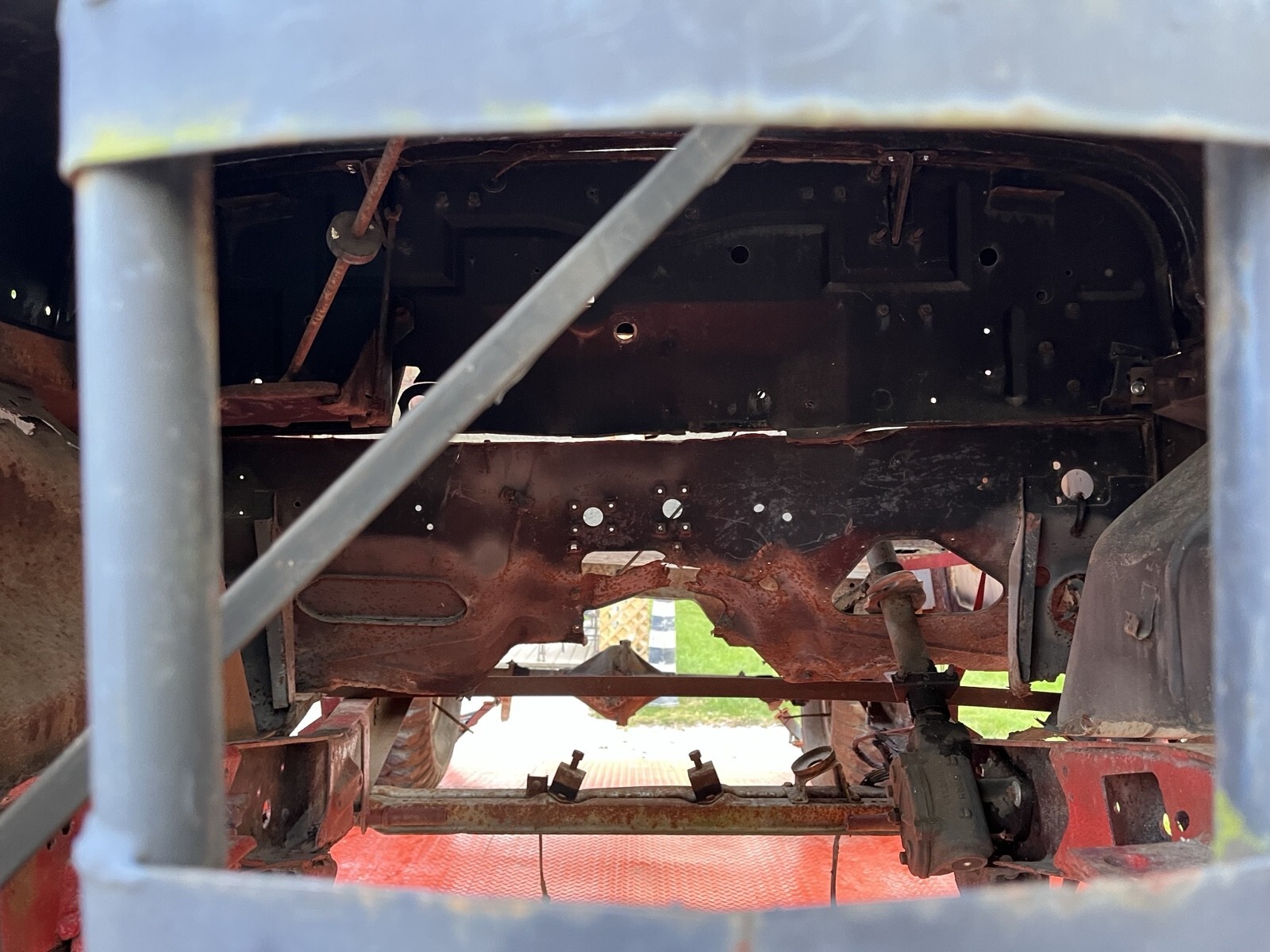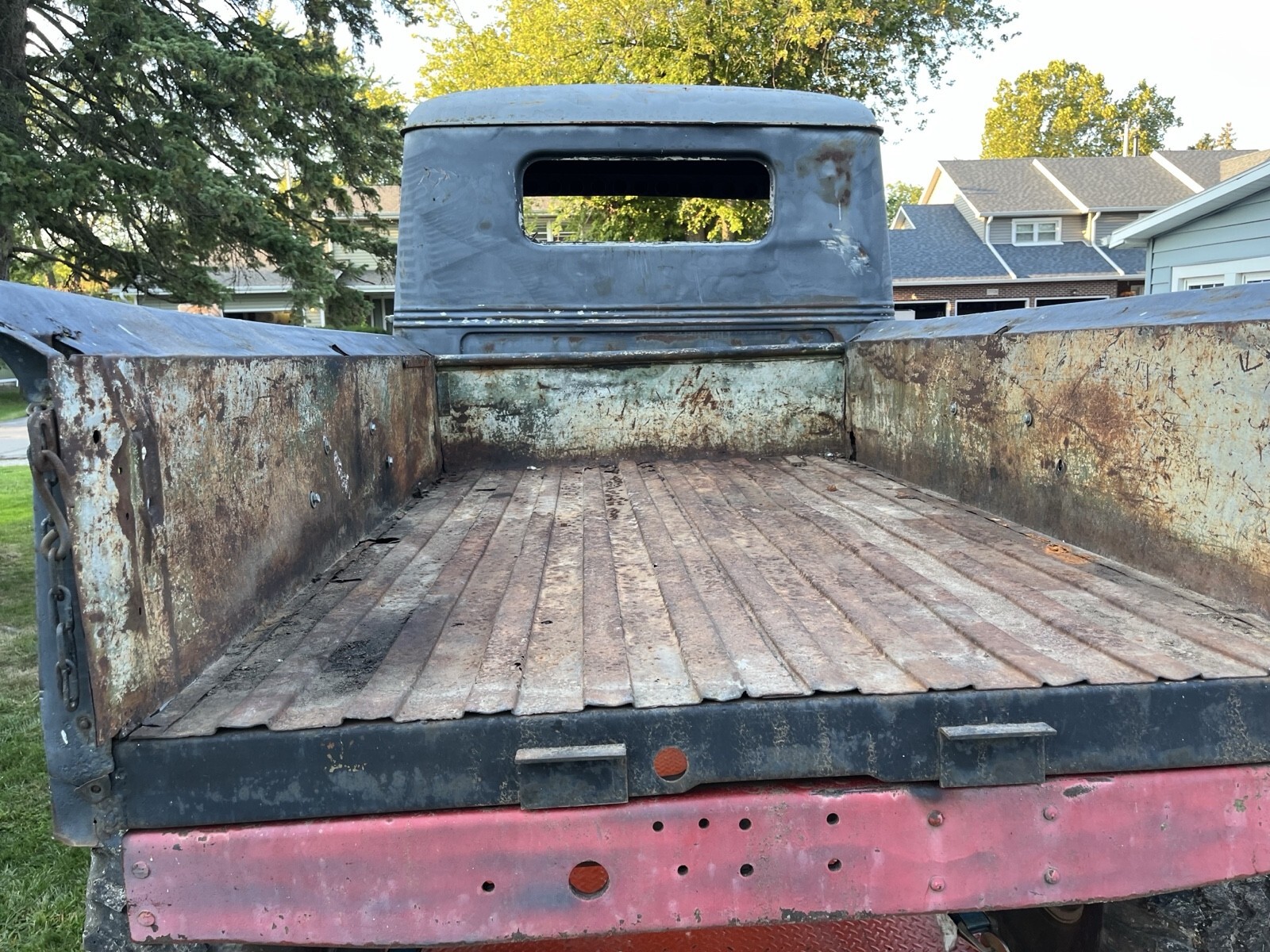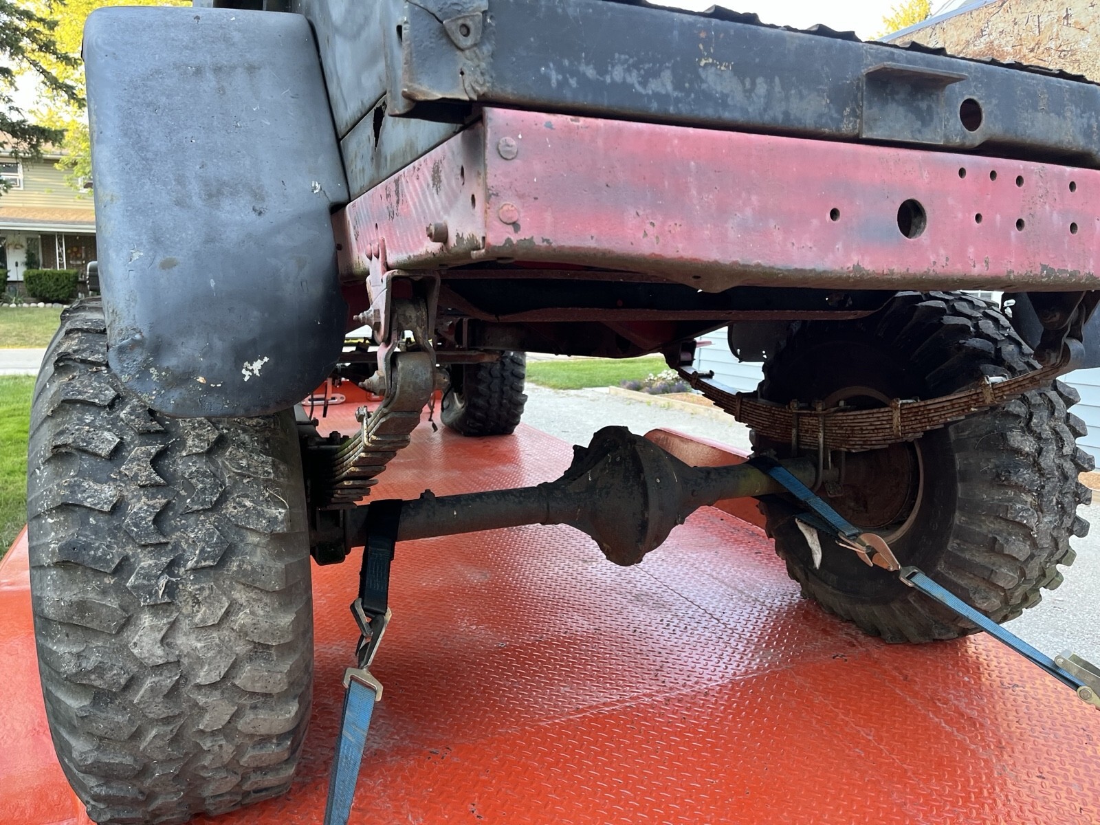 1950 Jeep Willys on 38 1/2 inch tall 15 wide 15 inch rim Mud tires, their gumbos original Jeep rear axle big lift kit, original frame, body hood bed upgraded front axle no motor needs some floor repair no transmission no title The hood scoop is just a façade. If you wanted to remove it it would be pretty easy to do. The hood is not cut. This truck would be great to turn back into a mud truck or use as a parts vehicle. Lots of potential left looks super cool would also make some really cool on lawn art
