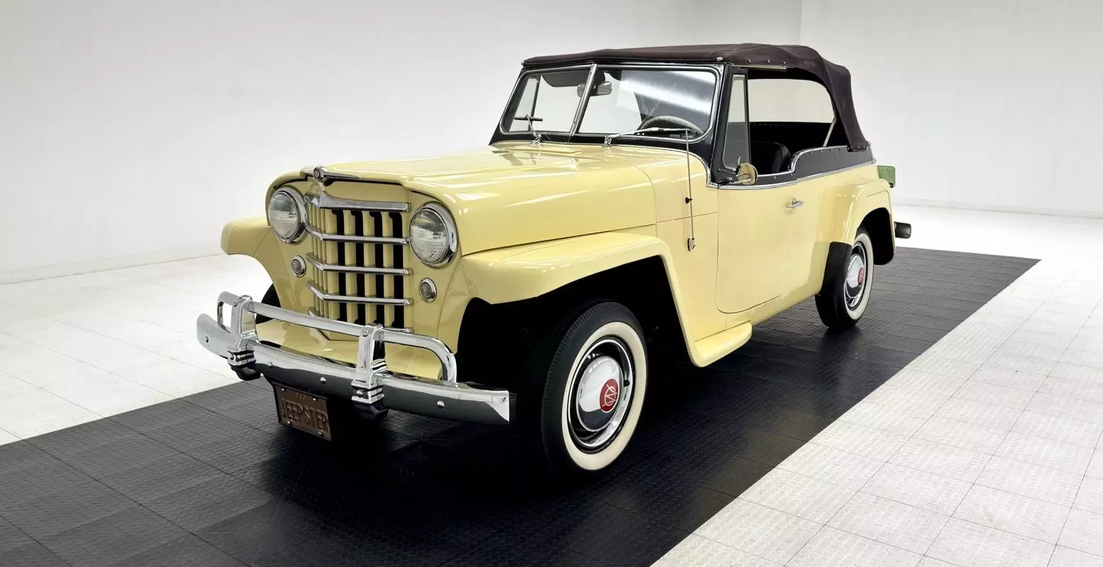 Jeepsters wear pale yellow better than just about any car, and this example is proof! It's contrasted by a glossy band of black that highlights the passenger compartment, trimmed in stainless for further emphasis and tied into the black canvas top. The updated V-shaped grille features bold horizontal bars, and a chrome bumper guard loops over the bumper itself, all in fine condition. Polished domed hubcaps with a red center "W" badge covers the 15-inch wheels with just a hint of black painted steel wheels underneath showing. At the back of this vehicle is an additional hanging spare white wall tire with hubcap in a continental kit style mount. Imperfections noted include several areas of paint runs, some fading of the canvas top, some hazing of the plastic window, and chipped paint.
