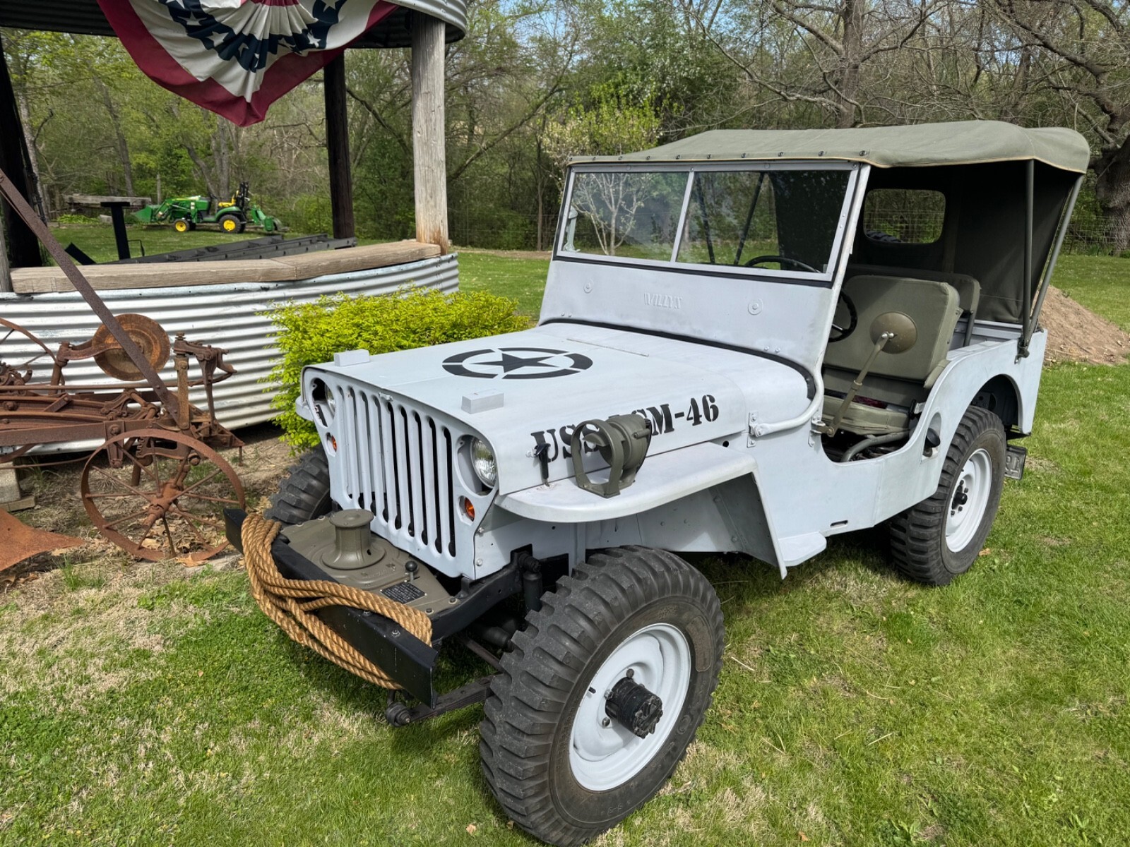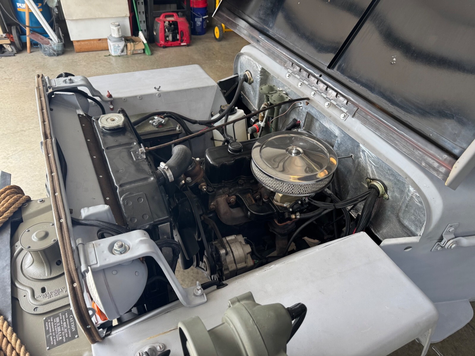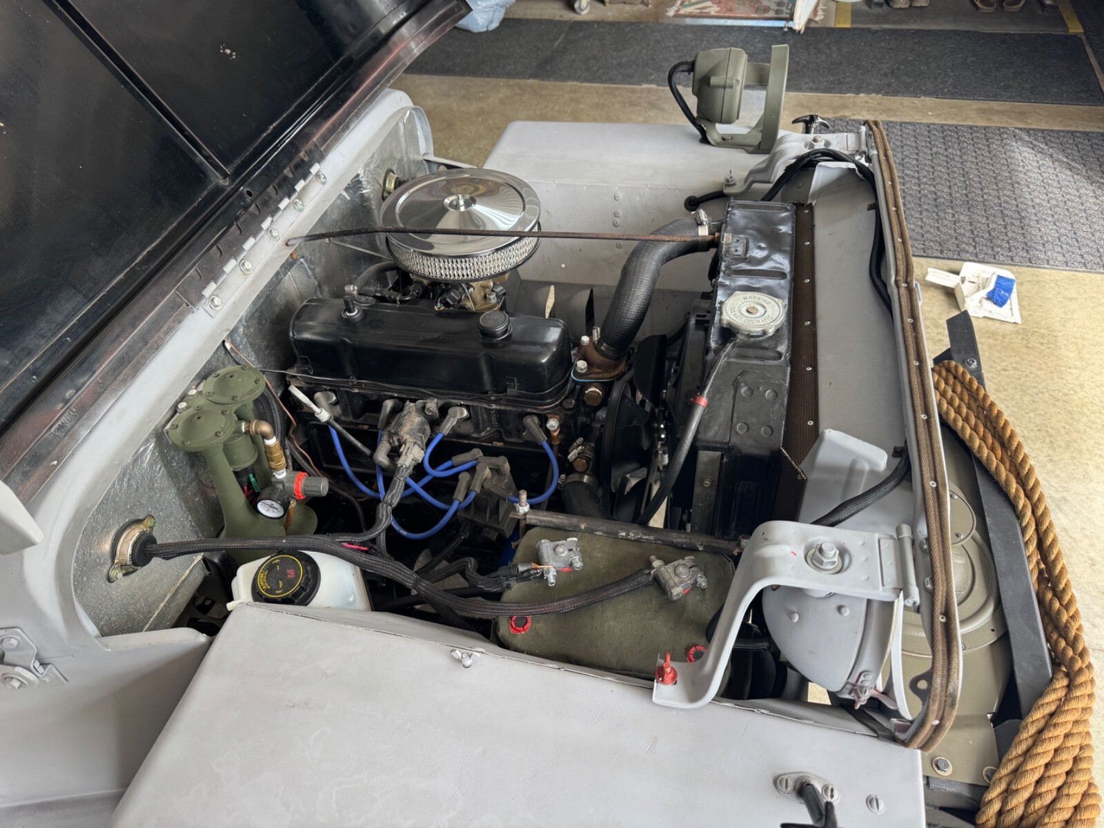 1946 Willys CJ2A. New remanufactured Chevy 153 from S&J in Spokane Valley, Washington, original transmission/ transfer case, Holley Sniper 1 barrel EFI, Hyperfuel in tank fuel pump, new fuel tank, new tub with MB rear panel (no tail gate), 9 slate MB grille, MB headlights, new tail lights, new master cylinder, new front brake cylinders, 12 volt system, electric fan, new red top gel battery, new gauges, new canvas, new glass, new tires, capstan winch, bluetooth receiver hidden under dash, onboard