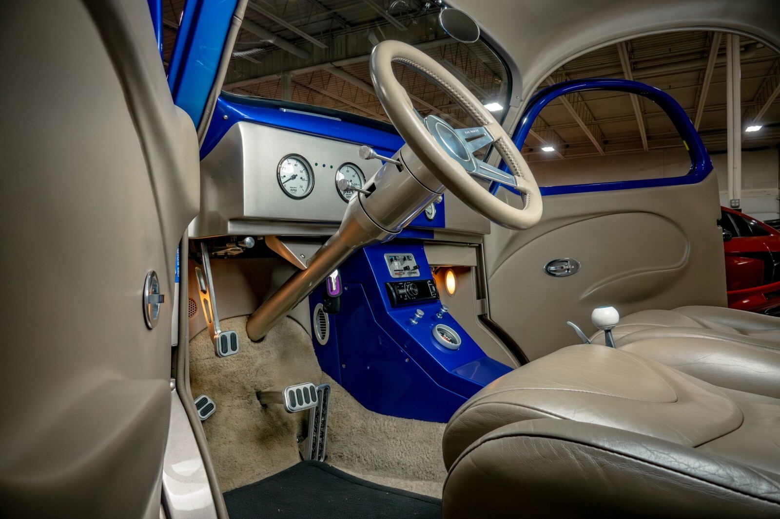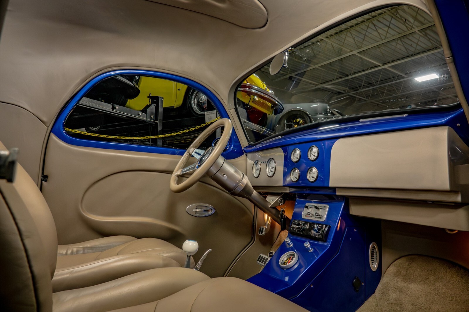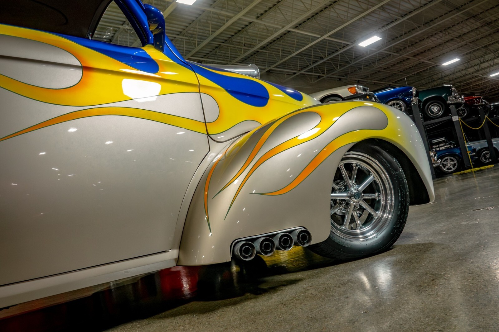 The exterior dazzles in a striking two-tone blue and silver finish, complete with yellow flame accents a nod to traditional gasser and street-rod roots. The body sits on a boxed and reinforced custom frame, with shaved handles, dual side mirrors, and front-fender exhaust outlets that highlight both craftsmanship and performance intent. Underneath, adjustable coil-over suspension and four-wheel disc brakes give the car real drivability and stopping power far beyond what the original Willys could have offered.