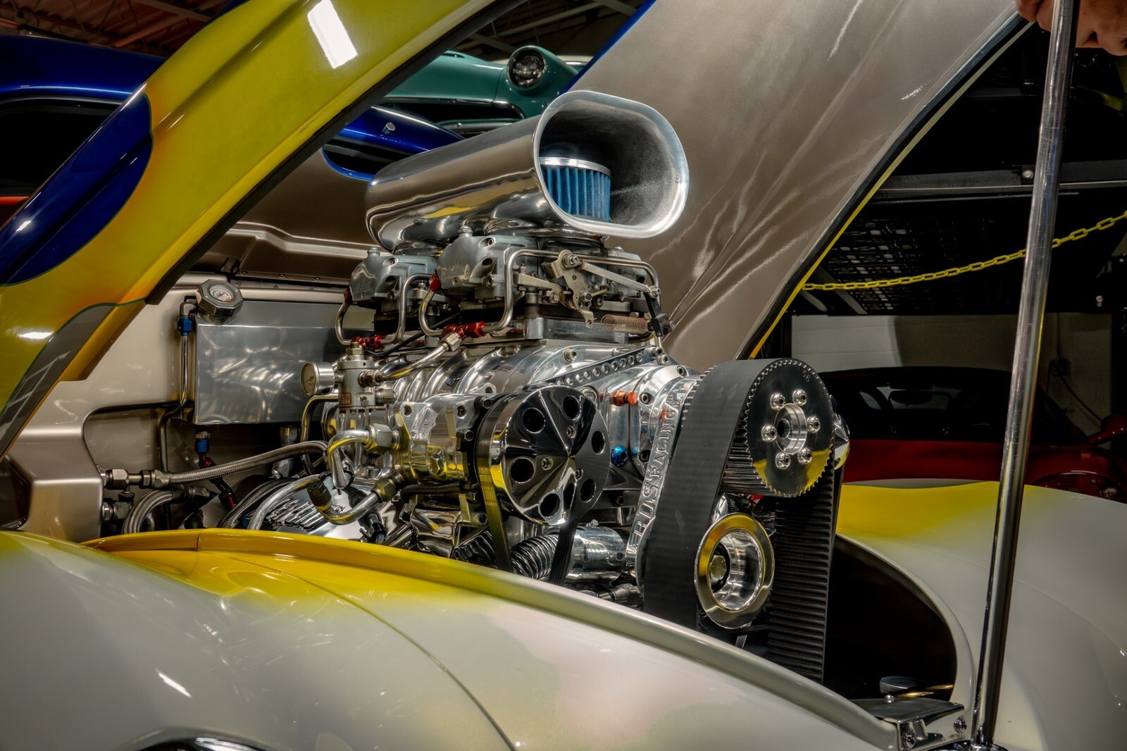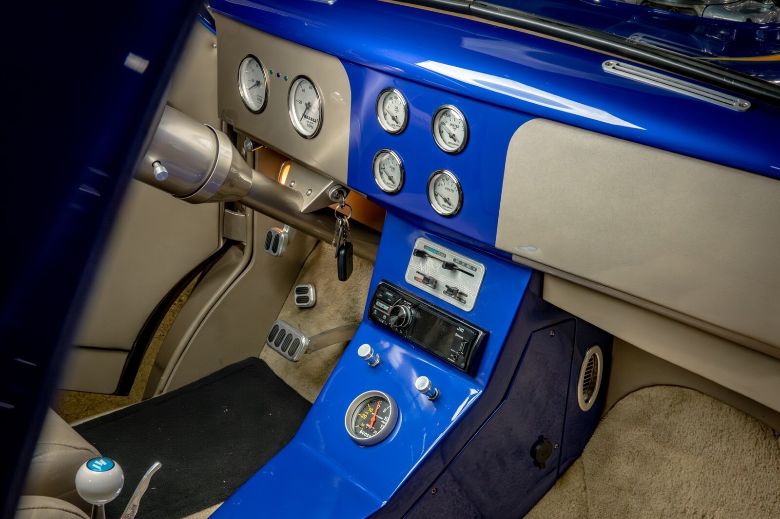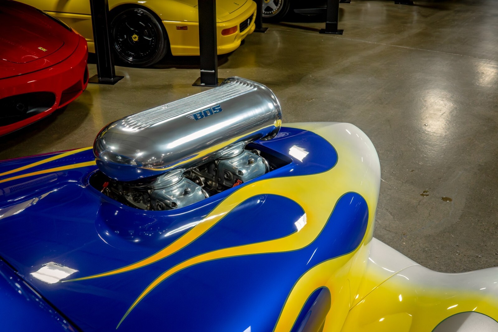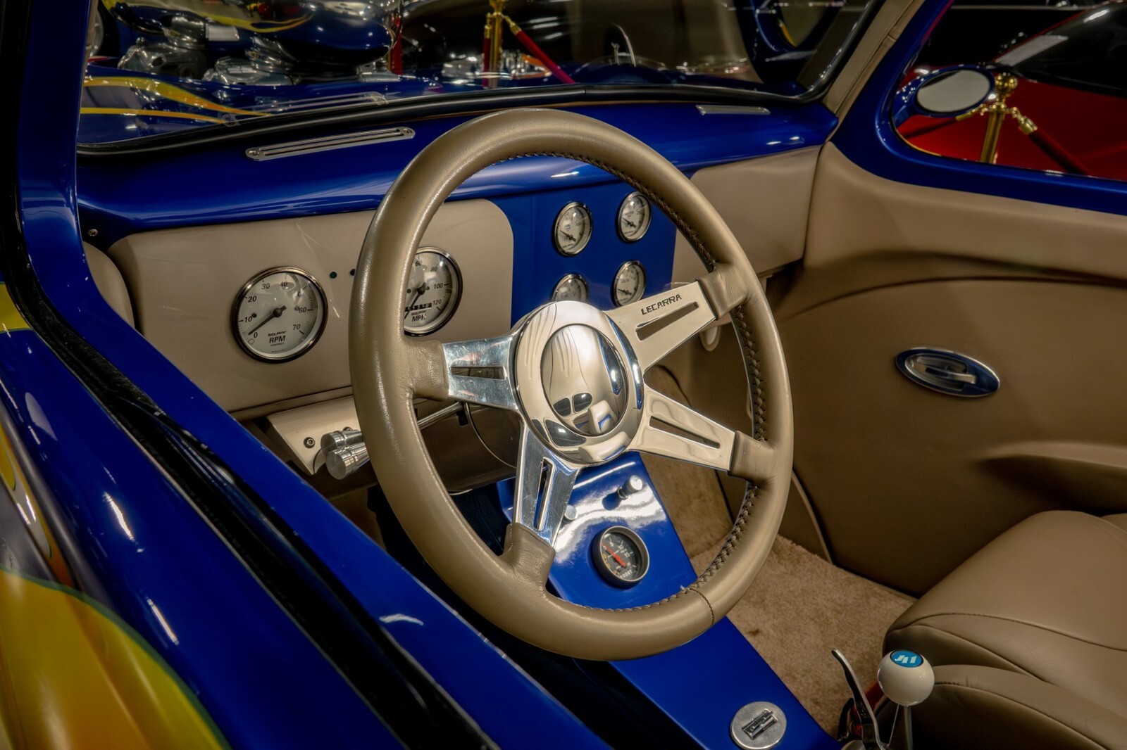 The exterior dazzles in a striking two-tone blue and silver finish, complete with yellow flame accents a nod to traditional gasser and street-rod roots. The body sits on a boxed and reinforced custom frame, with shaved handles, dual side mirrors, and front-fender exhaust outlets that highlight both craftsmanship and performance intent. Underneath, adjustable coil-over suspension and four-wheel disc brakes give the car real drivability and stopping power far beyond what the original Willys could have offered.