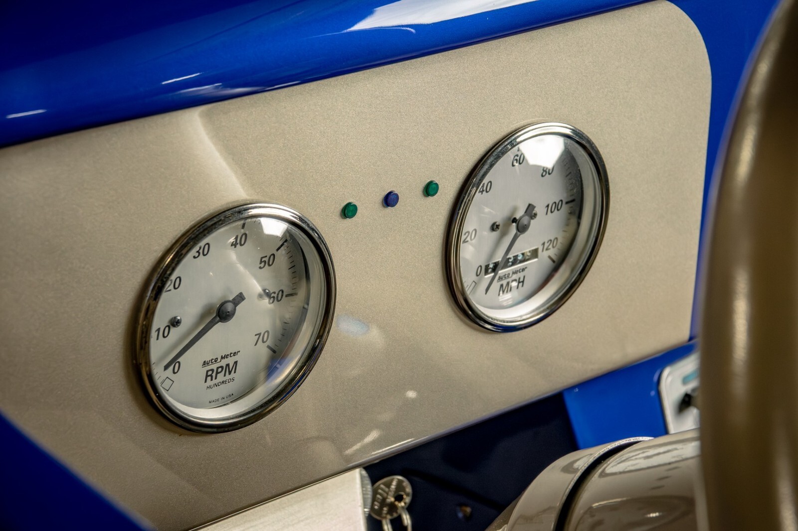 Step inside and you're greeted with a tan-upholstered interior featuring comfortable bucket seats, a tilt steering column, Vintage Air conditioning, power windows, and full AutoMeter instrumentation including boost, oil pressure, and temperature gauges. The trunk even carries a finished interior and subtle Willys badging, showing that this build spares no detail, blending function and show quality.