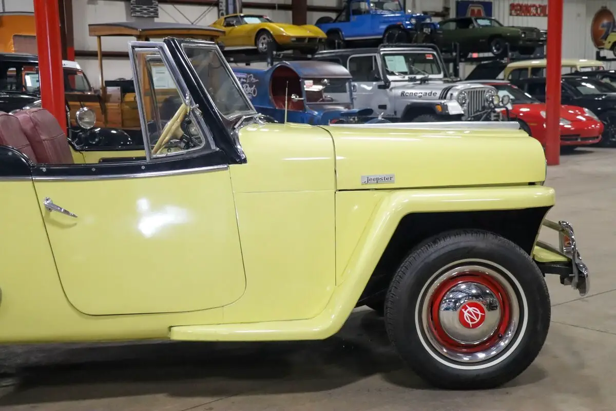 The exterior of this 1949 Jeepster is finished in a vibrant Fiesta Yellow, complemented by smooth curves and rugged lines that harken back to its adventurous roots. The rounded front end, adorned with a prominent chrome grille and vertical slats, gives the Jeepster an air of understated elegance. Chrome-trimmed headlights and contoured fenders seamlessly flow into the rear, creating a harmonious and balanced design. Inside, the cabin features functional simplicity with comfortable bench seats and a minimalistic dashboard. The gauges and controls are easily accessible, reflecting the utilitarian heritage of the Jeepster while offering a comfortable and open-top driving experience.