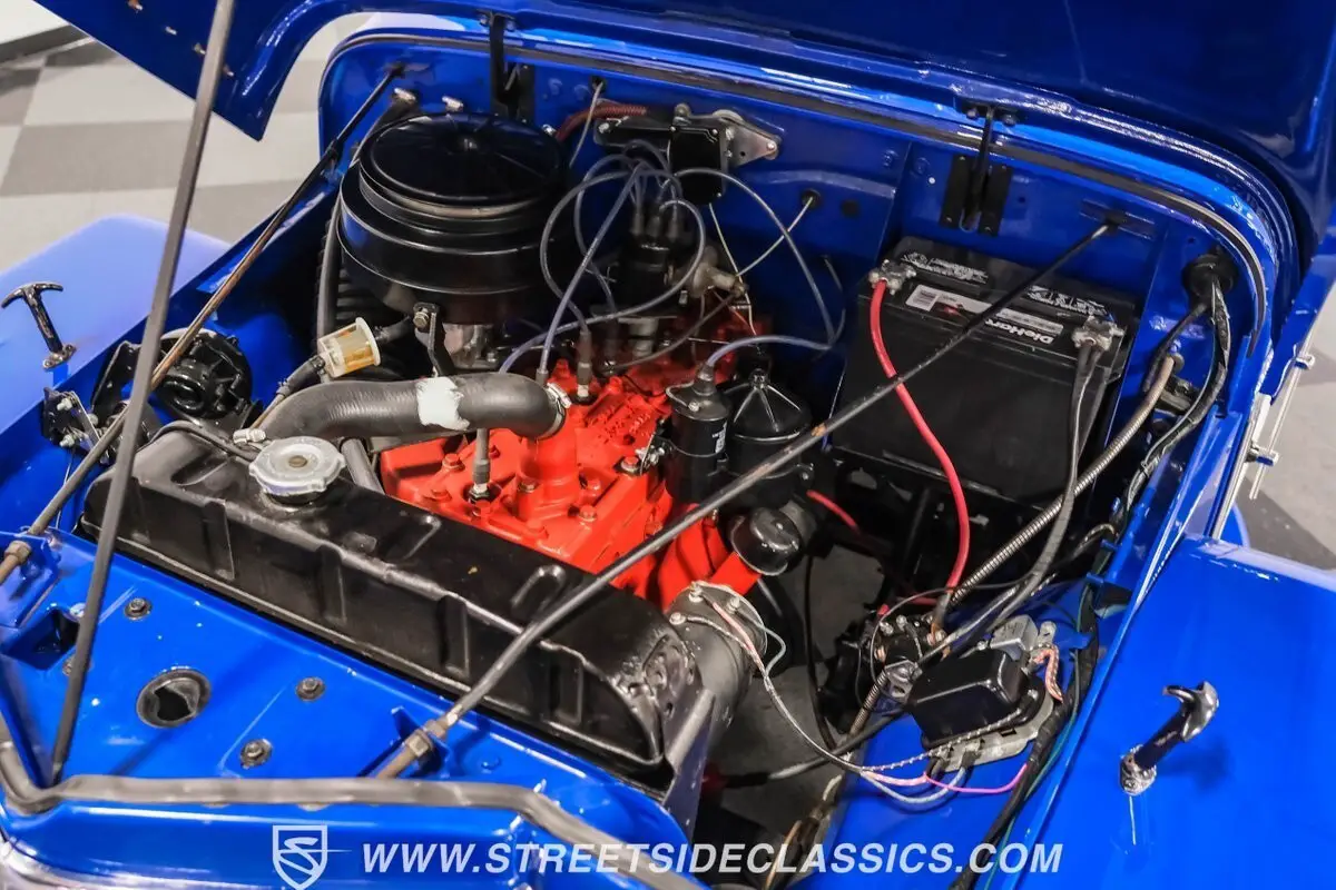 Under the hood, you'll find a very obedient 226 cubic-inch inline-6 cylinder engine, nicknamed the "Super Hurricane". It's paired with a 3-speed manual transmission that delivers power to the front and rear Dana 30 solid axles. Both axles use leaf springs with shocks for suspension duties, while at all four corners sit 15-inch painted black rims wrapped in 235/75R15 Yokohama tires. Drum brakes handle stopping power, and a stock exhaust system keeps this Willys sounding just right.