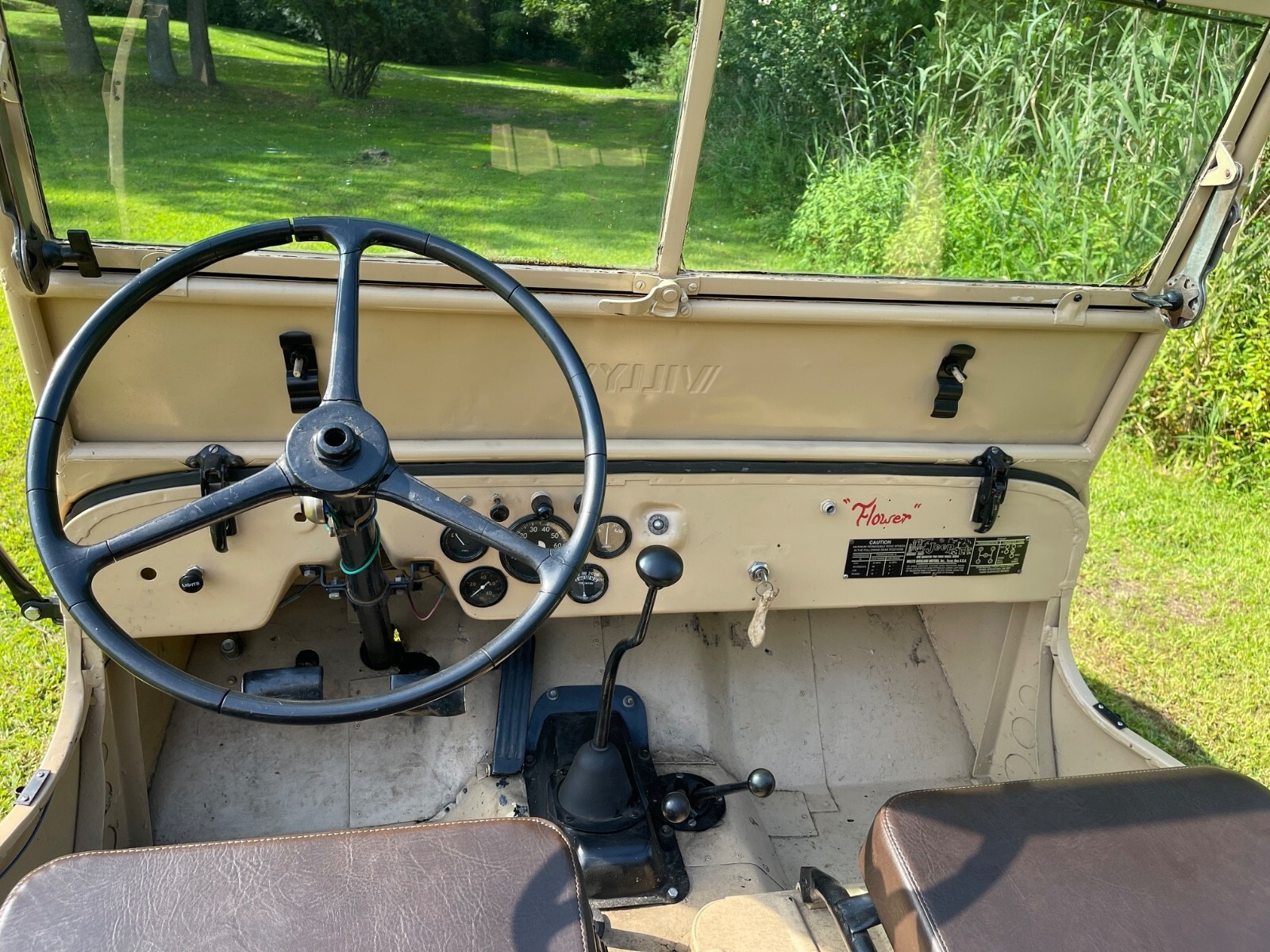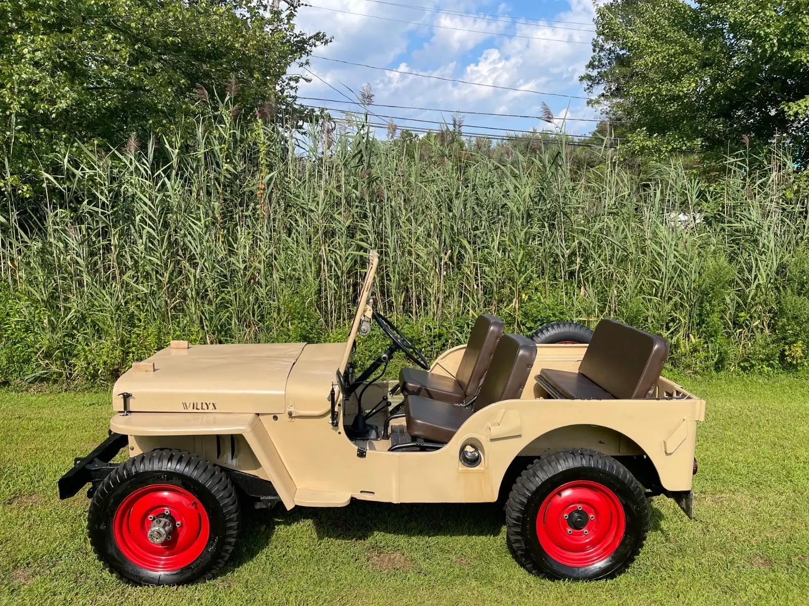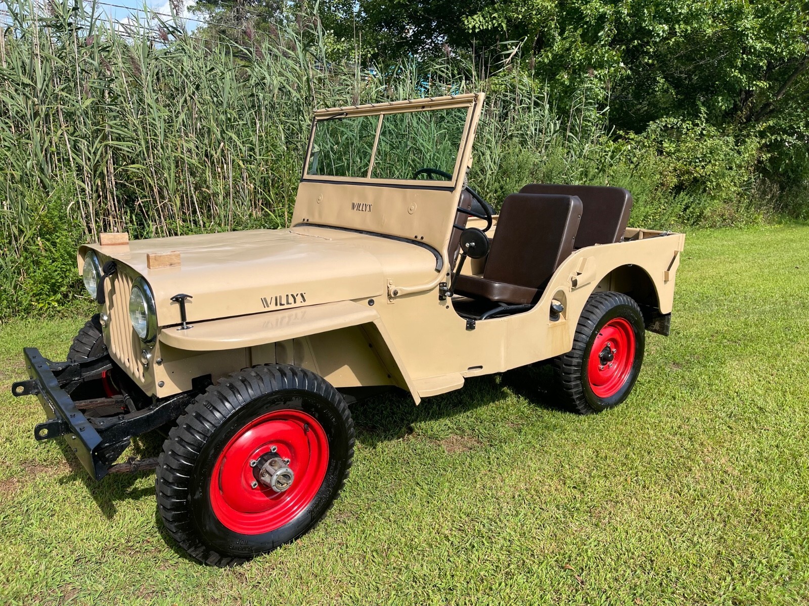 - This 1948 Willys Overland CJ-2A runs well and makes a great summer/beach/town/weekend vehicle!- The CJ2A - CJ being short for “Civilian Jeep” was the first full production CJ model created for non-military use.- Beige with brown interior gives it a military look, but civilian style.- Red trim wheels with a spare attached to the side.- Seats are all trimmed in Brown all weather brown vinyl.- Storage compartment under passenger seat.- Engine runs well.- Windshield tilts down in three positions.