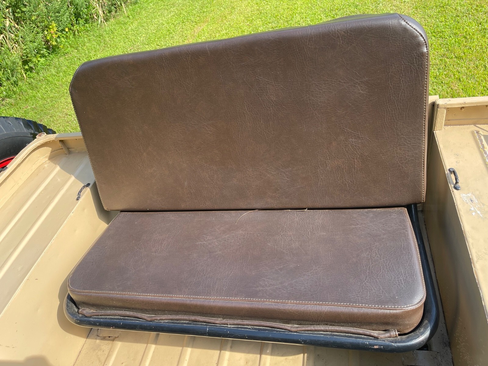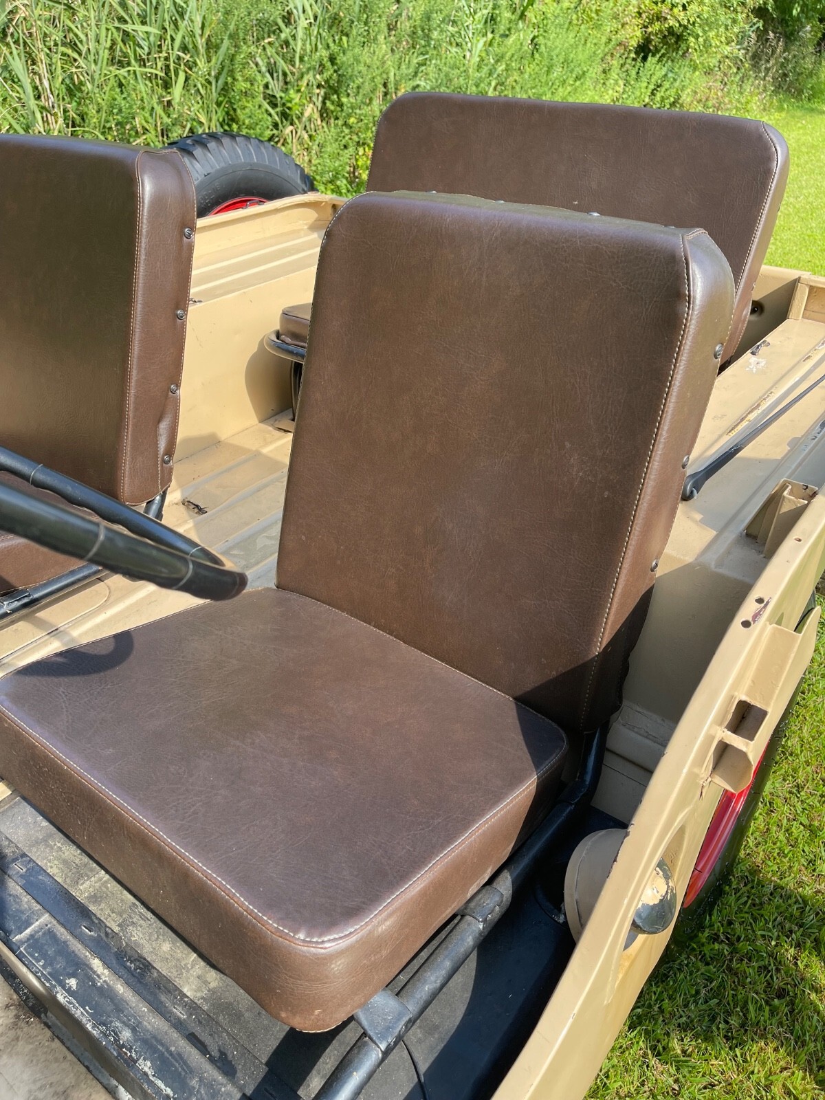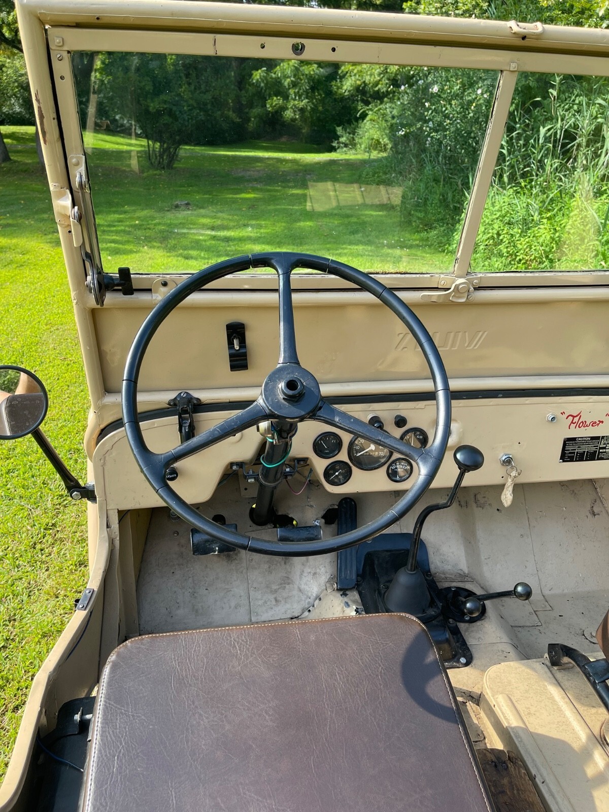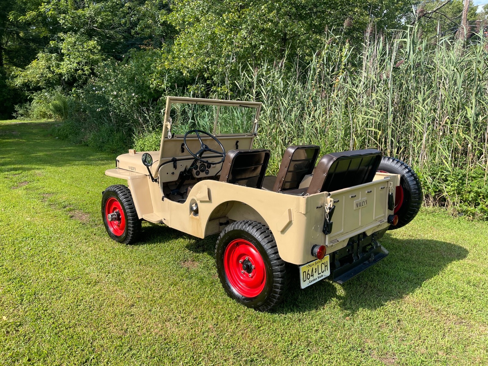 - This 1948 Willys Overland CJ-2A runs well and makes a great summer/beach/town/weekend vehicle!- The CJ2A - CJ being short for “Civilian Jeep” was the first full production CJ model created for non-military use.- Beige with brown interior gives it a military look, but civilian style.- Red trim wheels with a spare attached to the side.- Seats are all trimmed in Brown all weather brown vinyl.- Storage compartment under passenger seat.- Engine runs well.- Windshield tilts down in three positions.